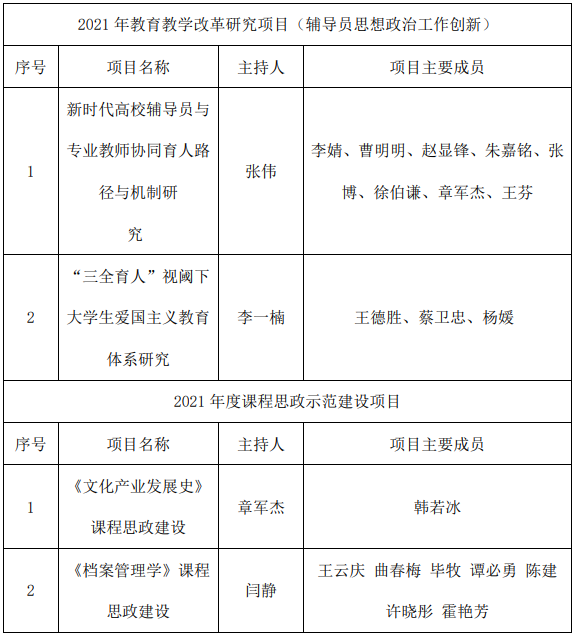 历史文化学院老师获批2021年度校级教育教学改革研究重点/培育项目1项,校级一般项目8项,课程思政示范建设项目2项。同时获批教育教学改革研究项目(辅导员思想政治工作创新)2项。