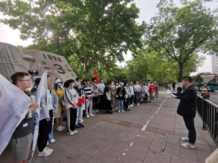 历史文化学院组织开展学生徒步缅怀活动,前往济南“五三惨案”纪念碑开展党史学习教育,致敬革命先烈。本次活动由辅导员曹明明、徐伯谦带队,130余名本、硕、博学生共同参与。