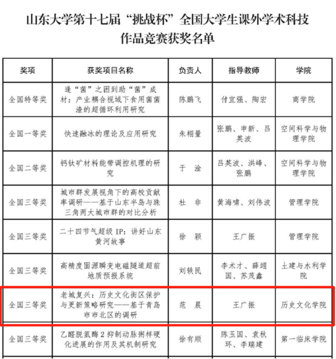 第十七届“挑战杯”全国大学生课外学术科技作品竞赛获奖名单公布,王广振老师指导、历史文化学院2019级硕士生范晨负责项目《老城复兴:历史文化街区保护与更新策略研究——基于青岛市市北区的调研》荣获三等奖。