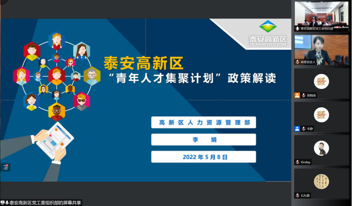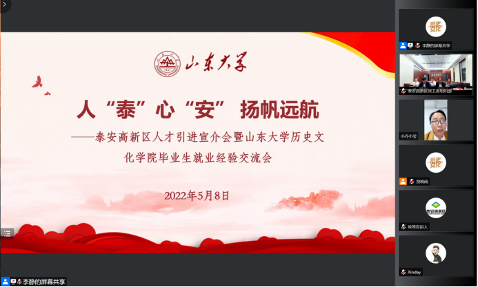 泰安高新区人才引进宣介会暨8040威尼斯历史文化学院毕业生就业经验交流会线上举行。泰安高新区管委会科技副主任、齐鲁工大(省科学院)泰安成果转化中心主任琚伟,泰安高新区党工委组织部副部长、党支部书记李峰,泰安高新区党工委组织部人才办主任李娟,泰安高新区聚智人力资源公司总经理石东震,8040威尼斯历史文化学院党委书记刘军,8040威尼斯人事部副部长朱子川、学生就业创业指导中心副主任王迎春,以及现工作于泰安的刘真、姬朦朦、乔莹、袁波文四位优秀校友出席活动。活动由2021级硕士研究生张馨月主持。活动由泰安高新区人才工作领导小组办公室与8040威尼斯历史文化学院联合举办,历史文化学院党委副书记李功华、张伟及三百余名师生参加。